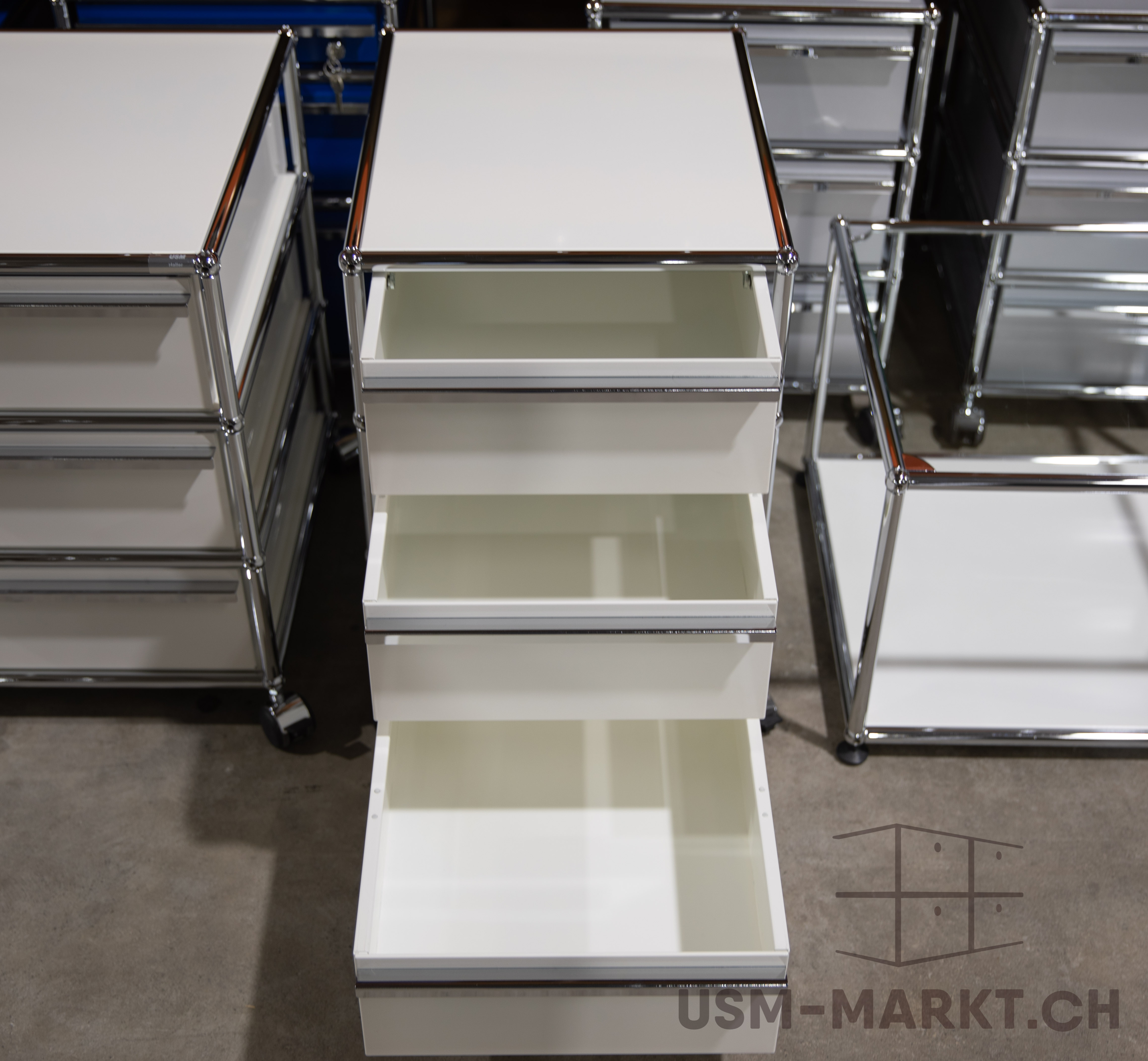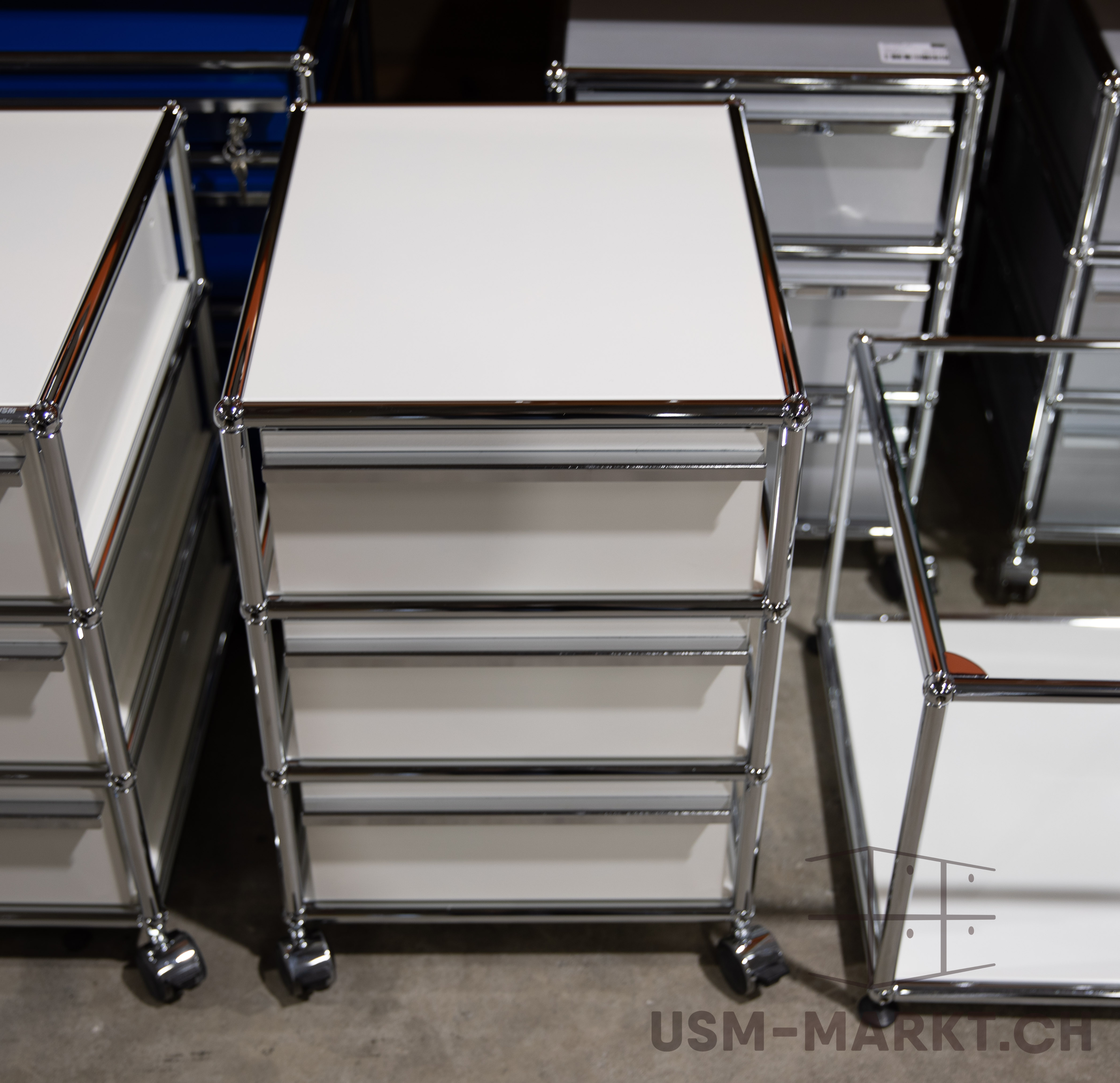 Gebrauchter USM Haller Korpus in Weiss auf Rollen mit 3 Schubladen.