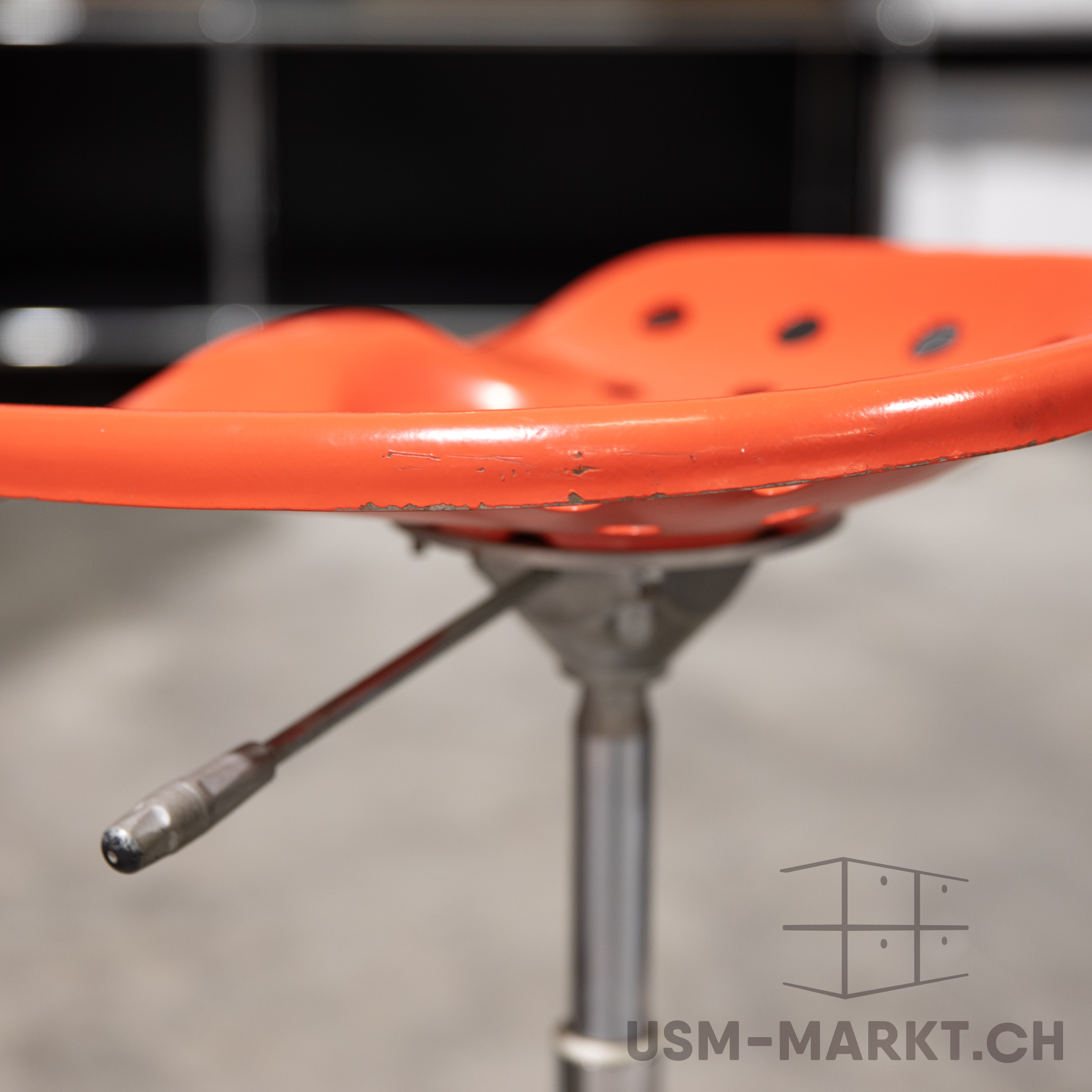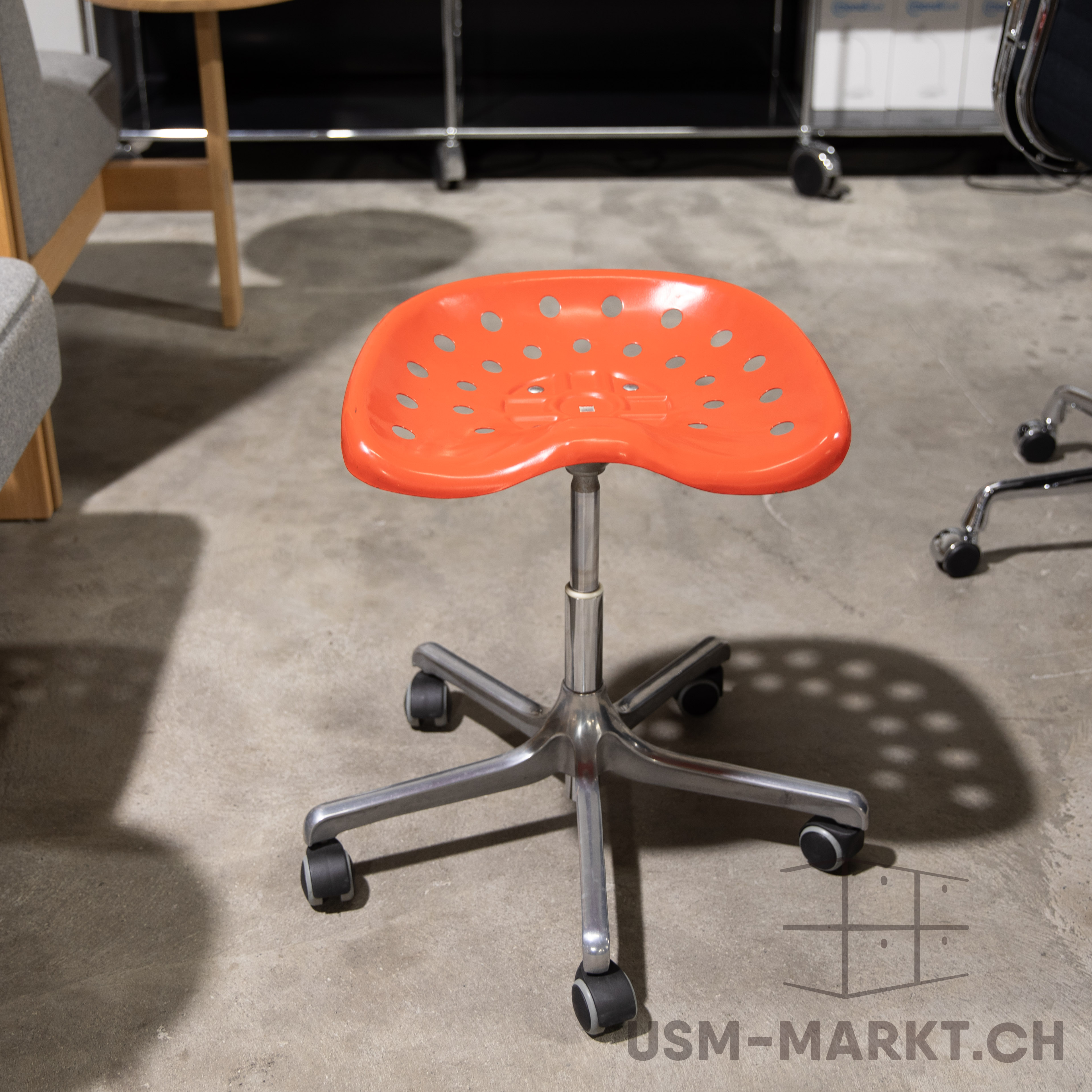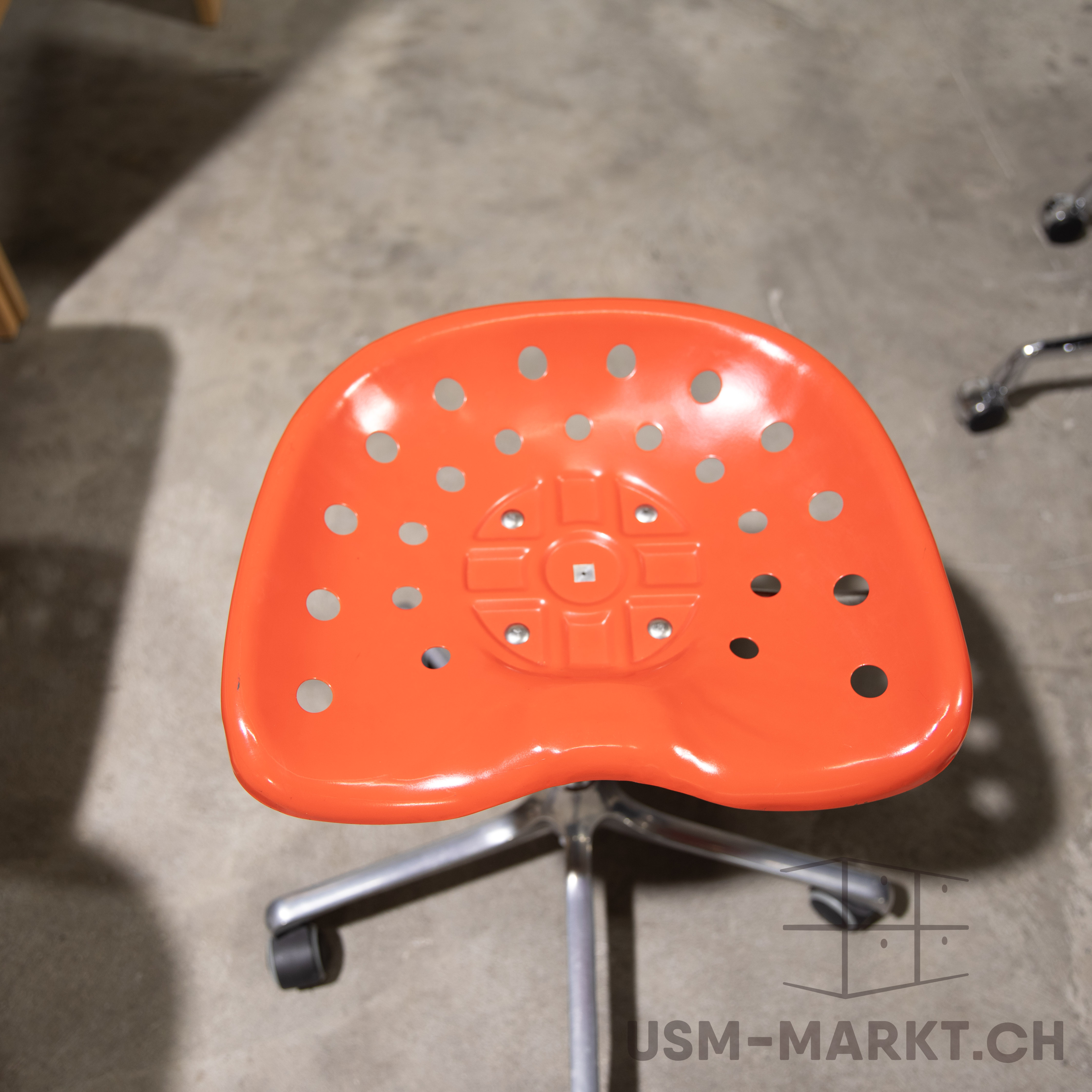Roter Traktorsitz auf fahrbarem Untersatz, mit 5 Rollen. Um 1970 entworfen von E. Fermiger....mehr